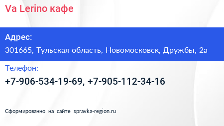 Va.Lerino, кафе по адресу 301665, Тульская область, Новомосковск, Дружбы, 2а в дальнейшем Организация, размещена в следующих категориях: