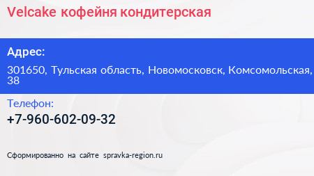 Velcake, кофейня-кондитерская по адресу 301650, Тульская область, Новомосковск, Комсомольская, 38 в дальнейшем Организация, размещена в следующих категориях: