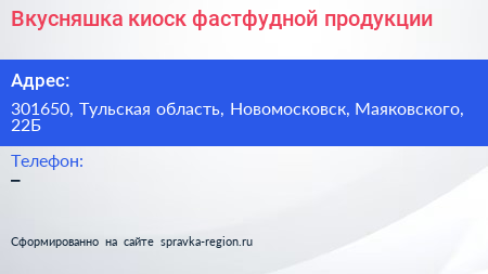 Вкусняшка, киоск фастфудной продукции по адресу 301650, Тульская область, Новомосковск, Маяковского, 22Б в дальнейшем Организация, размещена в следующих категориях: