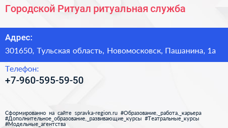 Городской Ритуал, ритуальная служба по адресу 301650, Тульская область, Новомосковск, Пашанина, 1а в дальнейшем Организация, размещена в следующих категориях: