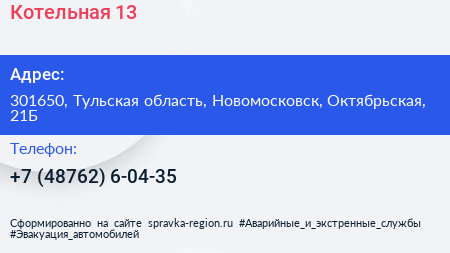 Котельная №13 по адресу 301650, Тульская область, Новомосковск, Октябрьская, 21Б в дальнейшем Организация, размещена в следующих категориях: