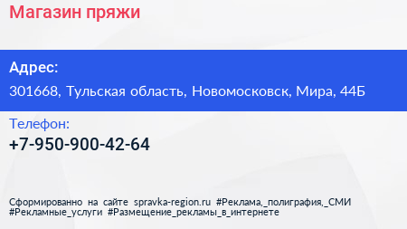 Магазин пряжи по адресу 301668, Тульская область, Новомосковск, Мира, 44Б в дальнейшем Организация, размещена в следующих категориях: