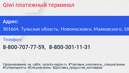Qiwi, платежный терминал по адресу 301664, Тульская область, Новомосковск, Маяковского, 18 в дальнейшем Организация, размещена в следующих категориях: