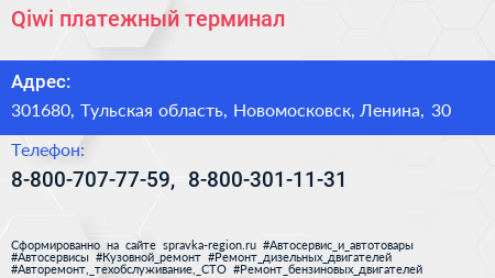 Qiwi, платежный терминал по адресу 301680, Тульская область, Новомосковск, Ленина, 30 в дальнейшем Организация, размещена в следующих категориях: