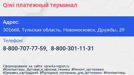 Qiwi, платежный терминал по адресу 301668, Тульская область, Новомосковск, Дружбы, 29 в дальнейшем Организация, размещена в следующих категориях: