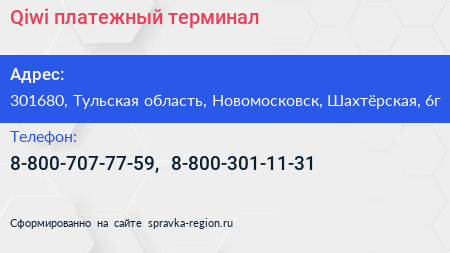 Qiwi, платежный терминал по адресу 301680, Тульская область, Новомосковск, Шахтёрская, 6г в дальнейшем Организация, размещена в следующих категориях: