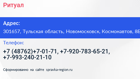 Ритуал по адресу 301657, Тульская область, Новомосковск, Космонавтов, 8Б в дальнейшем Организация, размещена в следующих категориях: