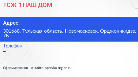 ТСЖ №1 НАШ ДОМ по адресу 301668, Тульская область, Новомосковск, Орджоникидзе, 7Б в дальнейшем Организация, размещена в следующих категориях: