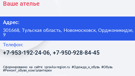 Ваше ателье по адресу 301668, Тульская область, Новомосковск, Орджоникидзе, 9 в дальнейшем Организация, размещена в следующих категориях: