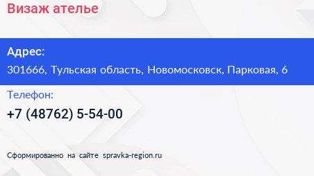 Визаж, ателье по адресу 301666, Тульская область, Новомосковск, Парковая, 6 в дальнейшем Организация, размещена в следующих категориях: