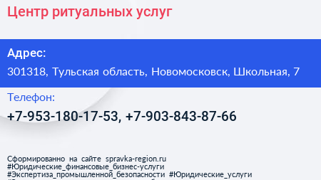 Центр ритуальных услуг по адресу 301318, Тульская область, Новомосковск, Школьная, 7 в дальнейшем Организация, размещена в следующих категориях:
