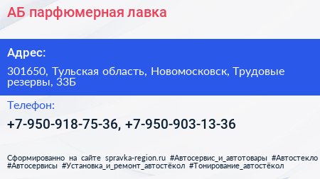АБ, парфюмерная лавка по адресу 301650, Тульская область, Новомосковск, Трудовые резервы, 33Б в дальнейшем Организация, размещена в следующих категориях: