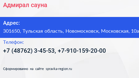 Адмирал, сауна по адресу 301650, Тульская область, Новомосковск, Московская, 10а в дальнейшем Организация, размещена в следующих категориях: