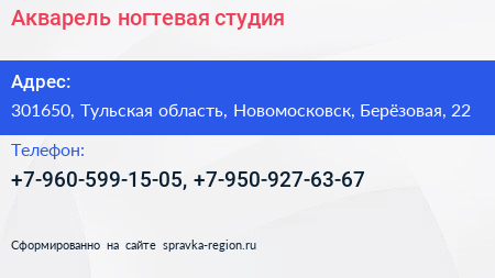 Акварель, ногтевая студия по адресу 301650, Тульская область, Новомосковск, Берёзовая, 22 в дальнейшем Организация, размещена в следующих категориях: