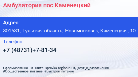 Амбулатория, пос. Каменецкий по адресу 301631, Тульская область, Новомосковск, Каменецкая, 10 в дальнейшем Организация, размещена в следующих категориях: