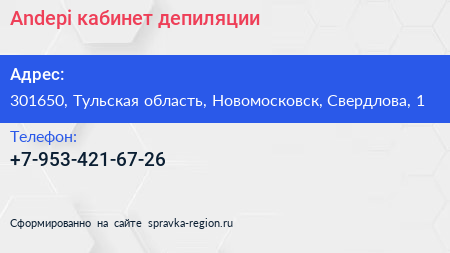 Andepi, кабинет депиляции по адресу 301650, Тульская область, Новомосковск, Свердлова, 1 в дальнейшем Организация, размещена в следующих категориях: