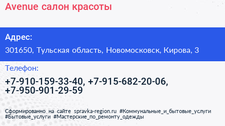 Avenue, салон красоты по адресу 301650, Тульская область, Новомосковск, Кирова, 3 в дальнейшем Организация, размещена в следующих категориях: