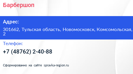 Барбершоп по адресу 301662, Тульская область, Новомосковск, Комсомольская, 2 в дальнейшем Организация, размещена в следующих категориях: