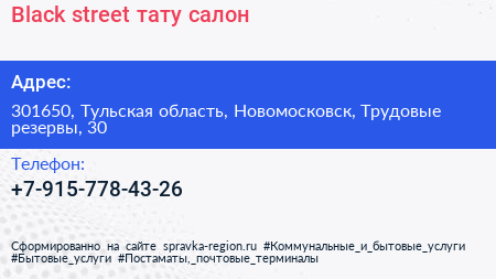 Black street, тату-салон по адресу 301650, Тульская область, Новомосковск, Трудовые резервы, 30 в дальнейшем Организация, размещена в следующих категориях: