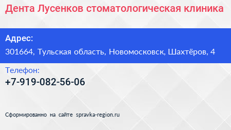 Дента-Лусенков, стоматологическая клиника по адресу 301664, Тульская область, Новомосковск, Шахтёров, 4 в дальнейшем Организация, размещена в следующих категориях: