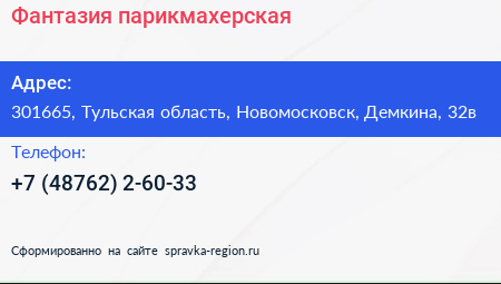 Фантазия, парикмахерская по адресу 301665, Тульская область, Новомосковск, Демкина, 32в в дальнейшем Организация, размещена в следующих категориях: