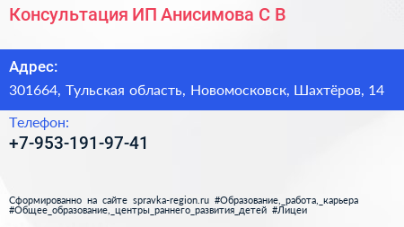 Консультация, ИП Анисимова С.В. по адресу 301664, Тульская область, Новомосковск, Шахтёров, 14 в дальнейшем Организация, размещена в следующих категориях: