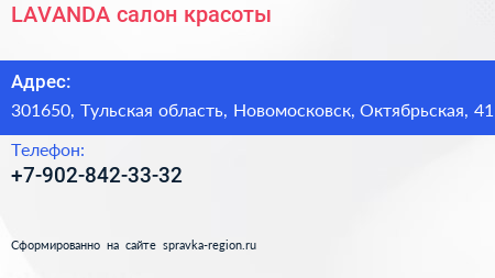 LAVANDA, салон красоты по адресу 301650, Тульская область, Новомосковск, Октябрьская, 41 в дальнейшем Организация, размещена в следующих категориях: