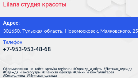 Lilana, студия красоты по адресу 301650, Тульская область, Новомосковск, Маяковского, 25 в дальнейшем Организация, размещена в следующих категориях: