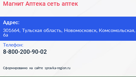 Магнит Аптека, сеть аптек по адресу 301664, Тульская область, Новомосковск, Комсомольская, 6а в дальнейшем Организация, размещена в следующих категориях:
