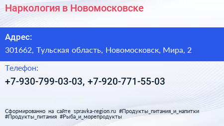 Наркология в Новомосковске по адресу 301662, Тульская область, Новомосковск, Мира, 2 в дальнейшем Организация, размещена в следующих категориях:
