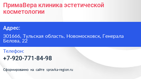 ПримаВера, клиника эстетической косметологии по адресу 301666, Тульская область, Новомосковск, Генерала Белова, 22 в дальнейшем Организация, размещена в следующих категориях: