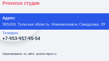 Provence, студия по адресу 301650, Тульская область, Новомосковск, Свердлова, 39 в дальнейшем Организация, размещена в следующих категориях: