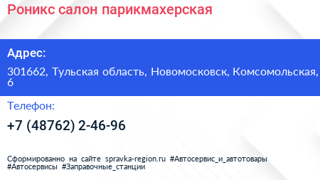 Роникс, салон-парикмахерская по адресу 301662, Тульская область, Новомосковск, Комсомольская, 6 в дальнейшем Организация, размещена в следующих категориях: