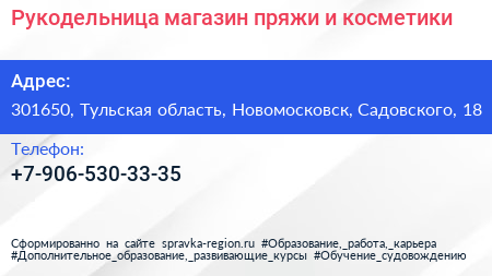 Рукодельница, магазин пряжи и косметики по адресу 301650, Тульская область, Новомосковск, Садовского, 18 в дальнейшем Организация, размещена в следующих категориях: