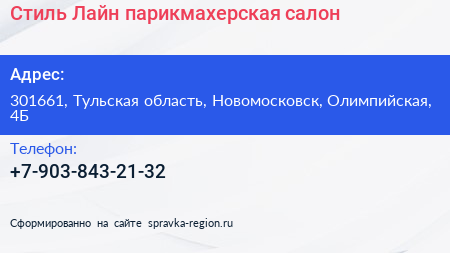 Стиль Лайн, парикмахерская-салон по адресу 301661, Тульская область, Новомосковск, Олимпийская, 4Б в дальнейшем Организация, размещена в следующих категориях: