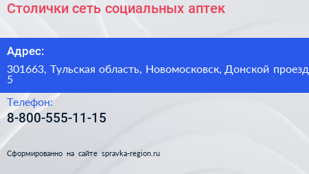 Столички, сеть социальных аптек по адресу 301663, Тульская область, Новомосковск, Донской проезд, 5 в дальнейшем Организация, размещена в следующих категориях:
