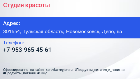 Студия красоты по адресу 301654, Тульская область, Новомосковск, Депо, 6а в дальнейшем Организация, размещена в следующих категориях: