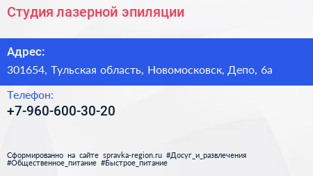 Студия лазерной эпиляции по адресу 301654, Тульская область, Новомосковск, Депо, 6а в дальнейшем Организация, размещена в следующих категориях: