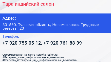Тара, индийский салон по адресу 301650, Тульская область, Новомосковск, Трудовые резервы, 23 в дальнейшем Организация, размещена в следующих категориях: