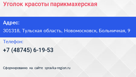 Уголок красоты, парикмахерская по адресу 301318, Тульская область, Новомосковск, Больничная, 9 в дальнейшем Организация, размещена в следующих категориях: