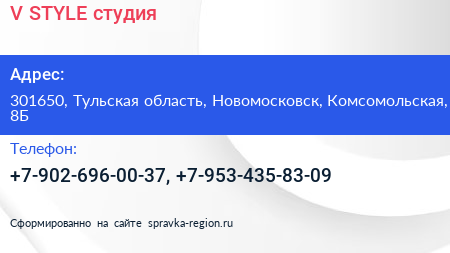 V-STYLE, студия по адресу 301650, Тульская область, Новомосковск, Комсомольская, 8Б в дальнейшем Организация, размещена в следующих категориях: