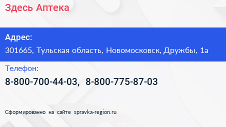 Здесь Аптека по адресу 301665, Тульская область, Новомосковск, Дружбы, 1а в дальнейшем Организация, размещена в следующих категориях: