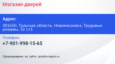 Магазин дверей по адресу 301650, Тульская область, Новомосковск, Трудовые резервы, 52 ст1 в дальнейшем Организация, размещена в следующих категориях: