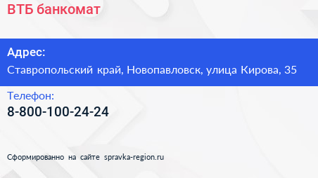 ВТБ, банкомат по адресу Ставропольский край, Новопавловск, улица Кирова, 35 в дальнейшем Организация, размещена в следующих категориях: