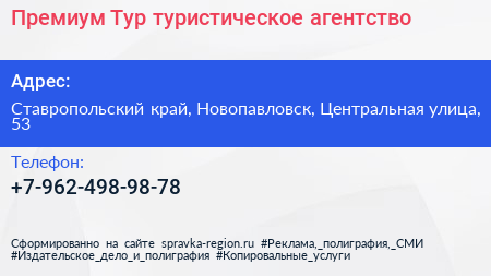 Премиум Тур, туристическое агентство по адресу Ставропольский край, Новопавловск, Центральная улица, 53 в дальнейшем Организация, размещена в следующих категориях: