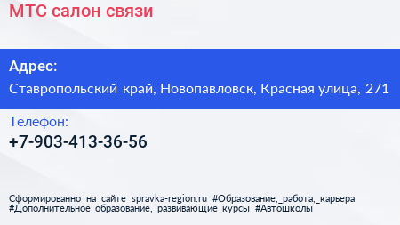 МТС, салон связи по адресу Ставропольский край, Новопавловск, Красная улица, 271 в дальнейшем Организация, размещена в следующих категориях: