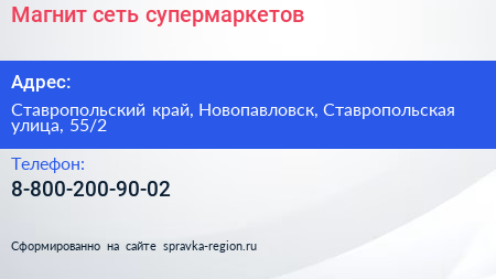 Магнит, сеть супермаркетов по адресу Ставропольский край, Новопавловск, Ставропольская улица, 55/2 в дальнейшем Организация, размещена в следующих категориях: