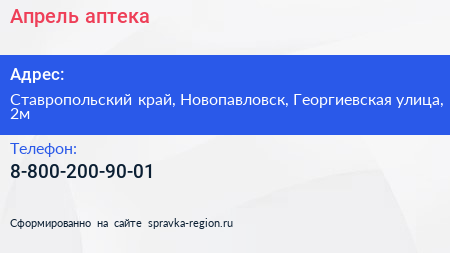 Апрель, аптека по адресу Ставропольский край, Новопавловск, Георгиевская улица, 2м в дальнейшем Организация, размещена в следующих категориях: