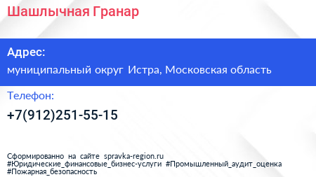 Шашлычная Гранар по адресу муниципальный округ Истра, Московская область в дальнейшем Организация, размещена в следующих категориях: