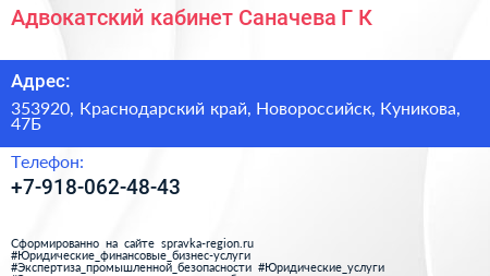 Адвокатский кабинет Саначева Г.К. по адресу 353920, Краснодарский край, Новороссийск, Куникова, 47Б в дальнейшем Организация, размещена в следующих категориях: